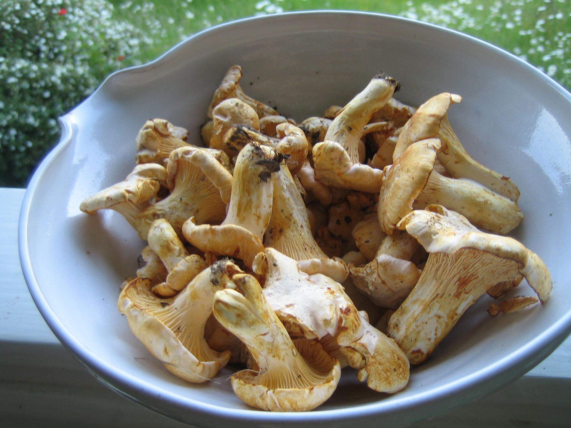 When I found one single chanterelle near one of the apple trees, I was so surprised. A chanterelle is a delicious edible mushroom. But what to do with one single one? Suddenly I remembered a neighbour talking of having seen chanterelles in our garden long before we moved in. Of course! If there is one, there are more of them. With rain pants on and boots – there are a lot of nasty bugs! –  I walked into the high grass tree area of the garden and started looking. One chanterIMG_0202IMG_0201elle suddenly turned into one litre( a quarter of a gallon)!! It’s amazing what gifts this garden give us. Butterfried chanterelles on a toast made a nice starter before dinner that evening 🙂
