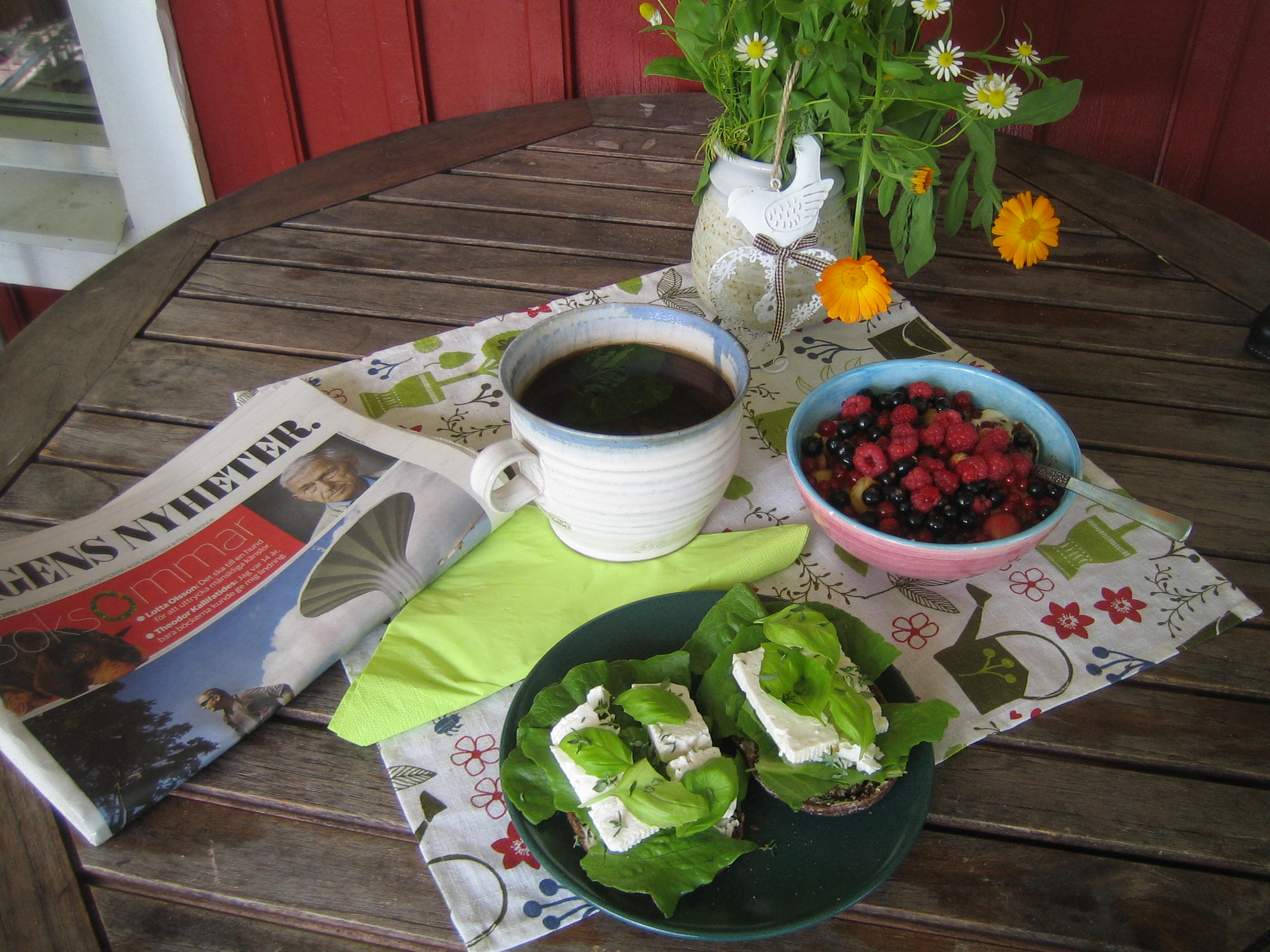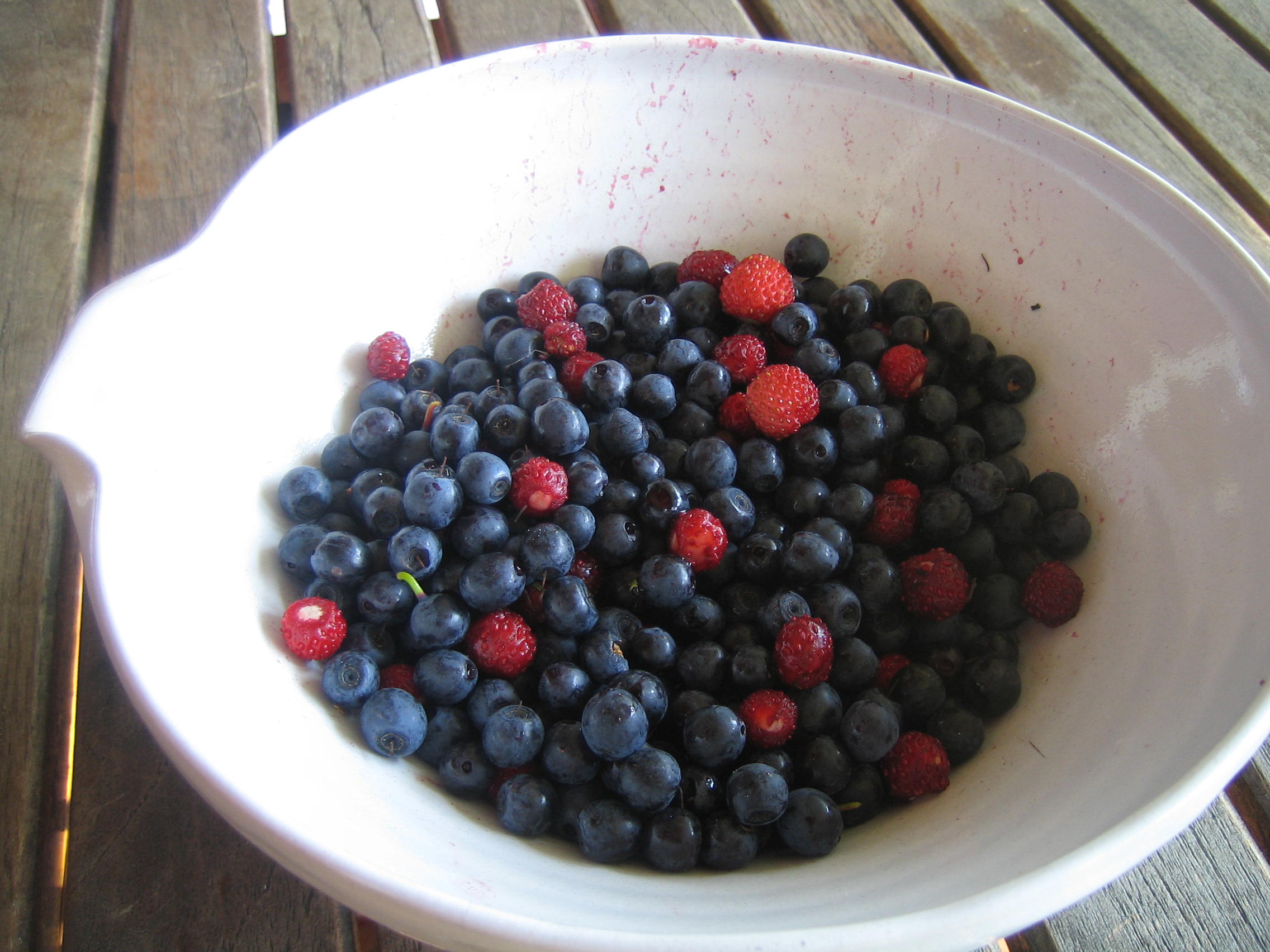 IMG_0231IMG_0230I am having some friends for lunch today. So what could the countryside offer them? Got the idea to take a look out in the woods behind our house. Spring was rainy, just what  blueberry plants need, perhaps I could find some berries for dessert? Guess what! The woods are full of blueberries. I even found some wild strawberries, made a nice mixture. So my guests will be treated with morning picked berries and icecream for dessert – the perfect summer treat, isn’t it?