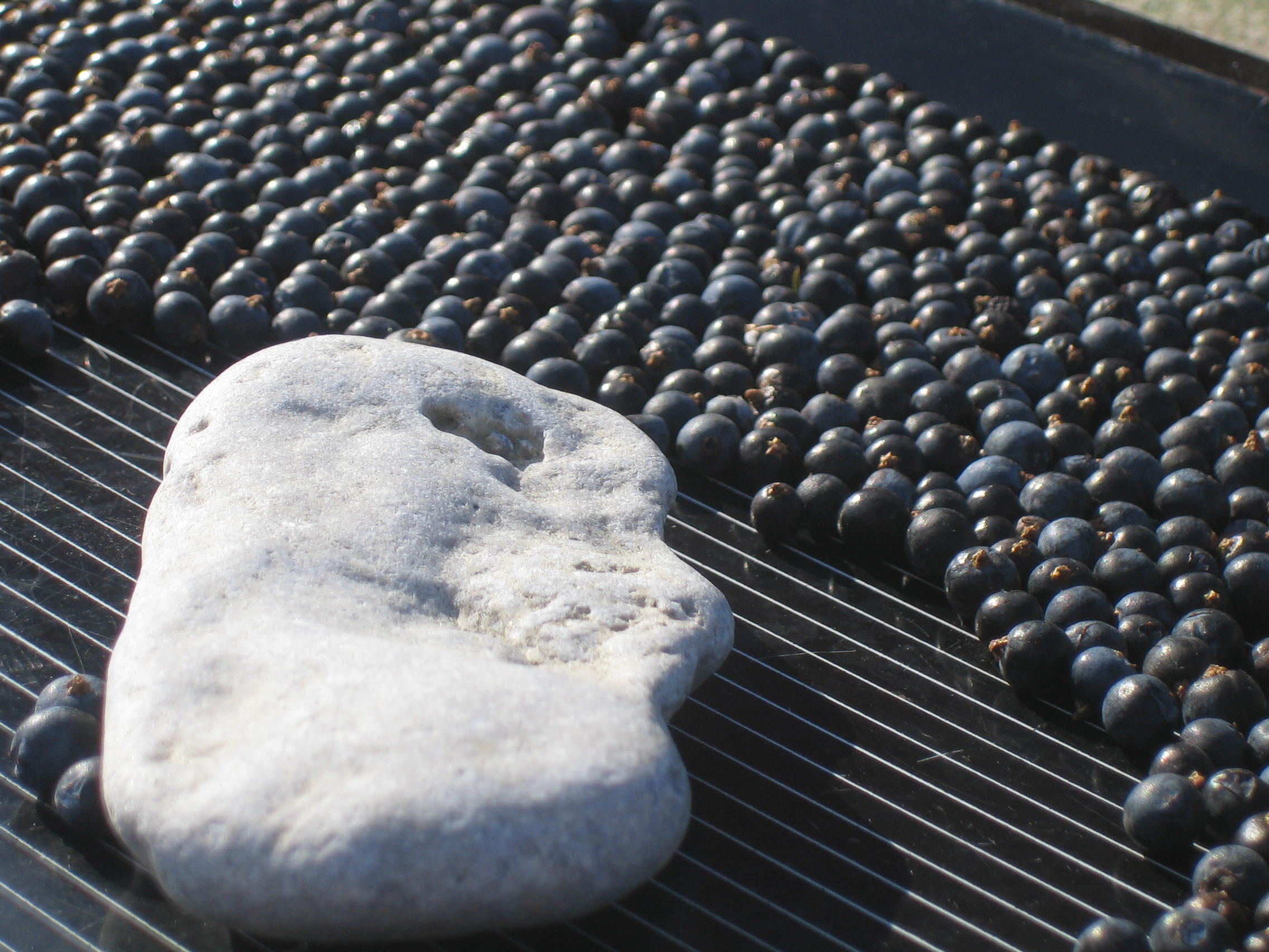 The tree/bush is full of sticky needles, but the ripe berries were easy to pick. I just held a bowl underneath a twig and shaked the twig lightly – and all the ripe berries fell into the bowl. Now they are drying in the sun.