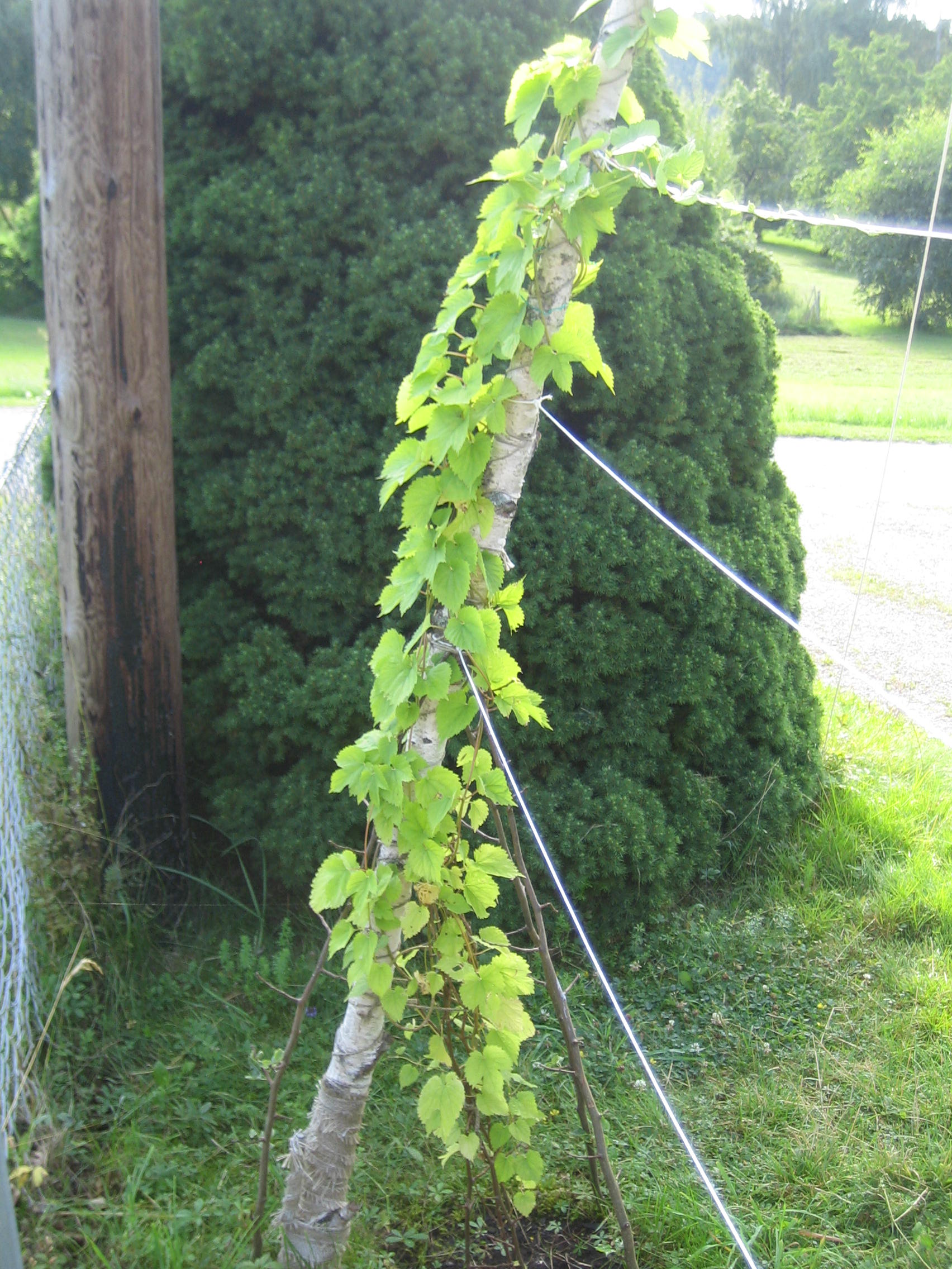 Beginning of June was the time for planting outside, in the garden. The neighbour only wanted to tend for one plant, the other three were in my care. Earlier that spring some neighbours had cut down young birch trees, and I asked if I could use them to build a special hops structure of my own. I used four trees, put them two and two in the form of a V and turned them upside down, then attached strings to them. Before my inner eye I saw a rich, secluded area with a bench, where I could relax and enjoy a cup of coffee.