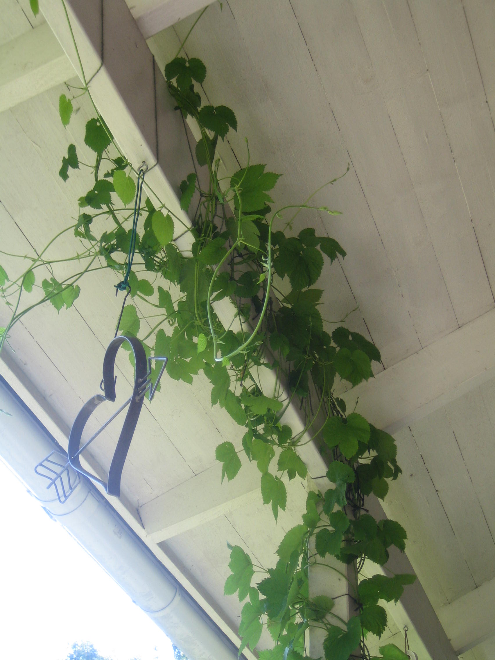 As you can see from the photos, this first year the plants are rather delicate. Beautiful, but not so filling in the structure. I don’t think we will have hops this year, but everyone IMG_0323in the hops business tell me the year 2 or 3 I will enjoy the richness of the hops. So patience is the most important ingredient in this business, it seems. The bench is there, and I can still have my coffee. But secluded … Not at all, yet. The third hop I planted in a pot on the veranda, and with protection from wind it grew a lot faster than the two down in the garden. Interesting to see the difference.